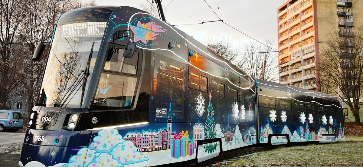 Pohádkové bytosti, lesní zvířátka, v pozadí ostravské dominanty v moderním neonovém designu, dvě svítící vlny v celkové délce 114 metrů, 15 svítících sněhových vloček. Takto je letos vyzdobená vánoční tramvaj Dopravního podniku Ostrava (DPO). Na cestující, kteří se s ní svezou, navíc čeká i vyzdobený interiér, hrající koledy a v průběhu adventu i program zahrnující například hudební vystoupení. Ostravská „Vánočka“ jezdí napříč městem, různými linkami, podle speciálního jízdního řádu.